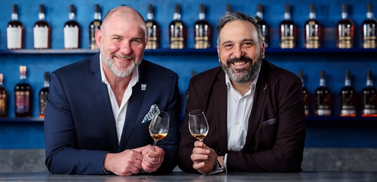 David Vitale, Starward Founder (R), and Paul McLeay, Australian Distillers Association CEO, pose for a photo during a media op at Starward Distillery, Melbourne, Australia on 6th August 2024. Source: Martin Keep